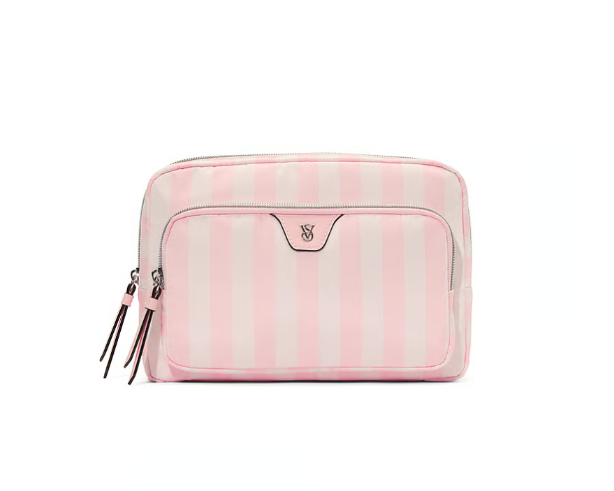 Optez pour un look glamour. Cette pochette à rayures signature, glissée dans votre sac fourre-tout ou votre cabas du jour, transportera tout votre nécessaire beauté.